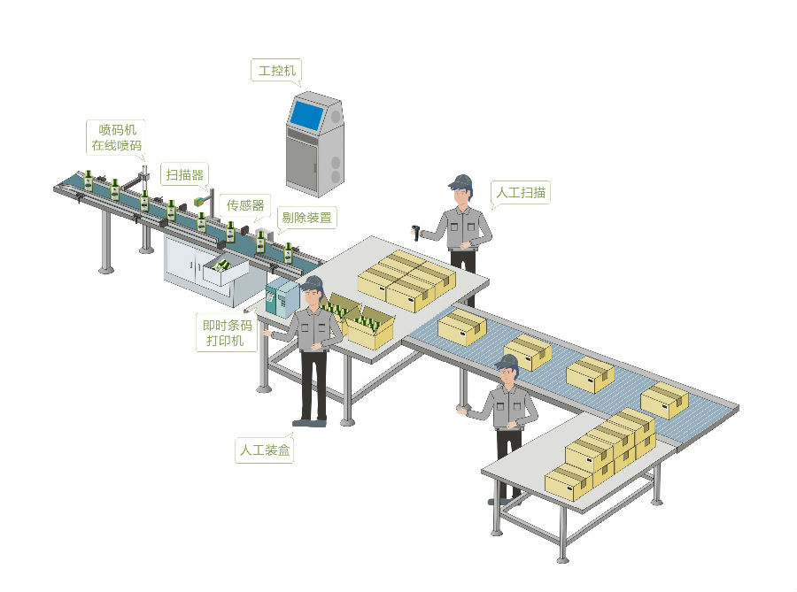 基于原有生产线,控制喷码机在线给单品喷印二维码,通过视觉检测、自动剔除设备,扫描二维码进行一、二级包装的数据关联,同时打印二级包装的条码,在通过检测的基础上条码进入数据库进行关联,打印标签直接贴在产品外包装,产品出库可进行相应功能的查询。